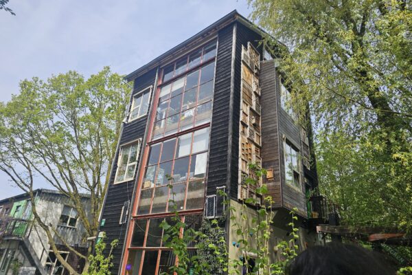 We begonnen bij Hof van Cartesius, een coöperatieve broedplaats direct naast station Zuilen. Wat het Hof onderscheidt van veel andere broedplaatsen is dat de makers zelf eigenaar zijn van de grond, waarmee de betaalbaarheid van werkruimte voor de lange termijn is geborgd. De Boomtoren, ontworpen door architect Alessandro Zena van Archifré, is een zichtbare uitdrukking van de werkwijze bij het Hof. Het gebouw is gemaakt van vrijwel uitsluitend hergebruikte materialen: hout van een gesloopte school in Rotterdam, deuren en ramen uit een woningbouwrenovatie, en perrondelen van station Maarn als fundering. De gevel is bekleed met houten mozaïektegels die als insectenhotel fungeren, mede ontworpen door MBO-studenten bouwkunde. ‘De tegels vormen een schuilplaats voor insecten, vogels en vleermuizen’, vertelde Alessandro Zena. Het gebouw staat daarmee symbool voor circulair bouwen én voor de zelforganiserende kracht van de makers die er werken.