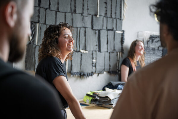 We sloten de rondgang af bij textielontwerper Nanette de Kool. Nanette zeefdrukt, wast en hermonteert restmaterialen en circulaire 3D-breisels tot wandstukken en ruimteverdelers, waarbij elke productiegeschiedenis zichtbaar blijft in het eindwerk. Ze deelt haar atelier binnenkort met een HKU-student, kenmerkend voor de uitwisseling die op De Nijverheid vanzelfsprekend is.
